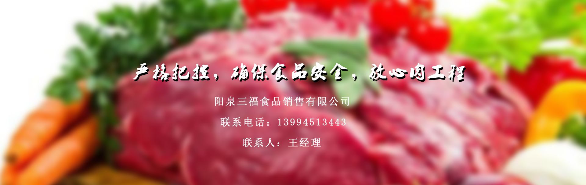陽泉三福食品銷售有限公司成立于二零零六年九月,位于陽泉市城區(qū)桃南中路28號,資質為一般納稅人,是政府批準的合法具有外調(diào)肉類的單位之一。在2012年獲得中國人民銀行頒發(fā)的AAA機構信用代碼證。現(xiàn)主要提供以下供貨渠道:     1、 冷鮮肉類的批發(fā)     2、 凍貨...